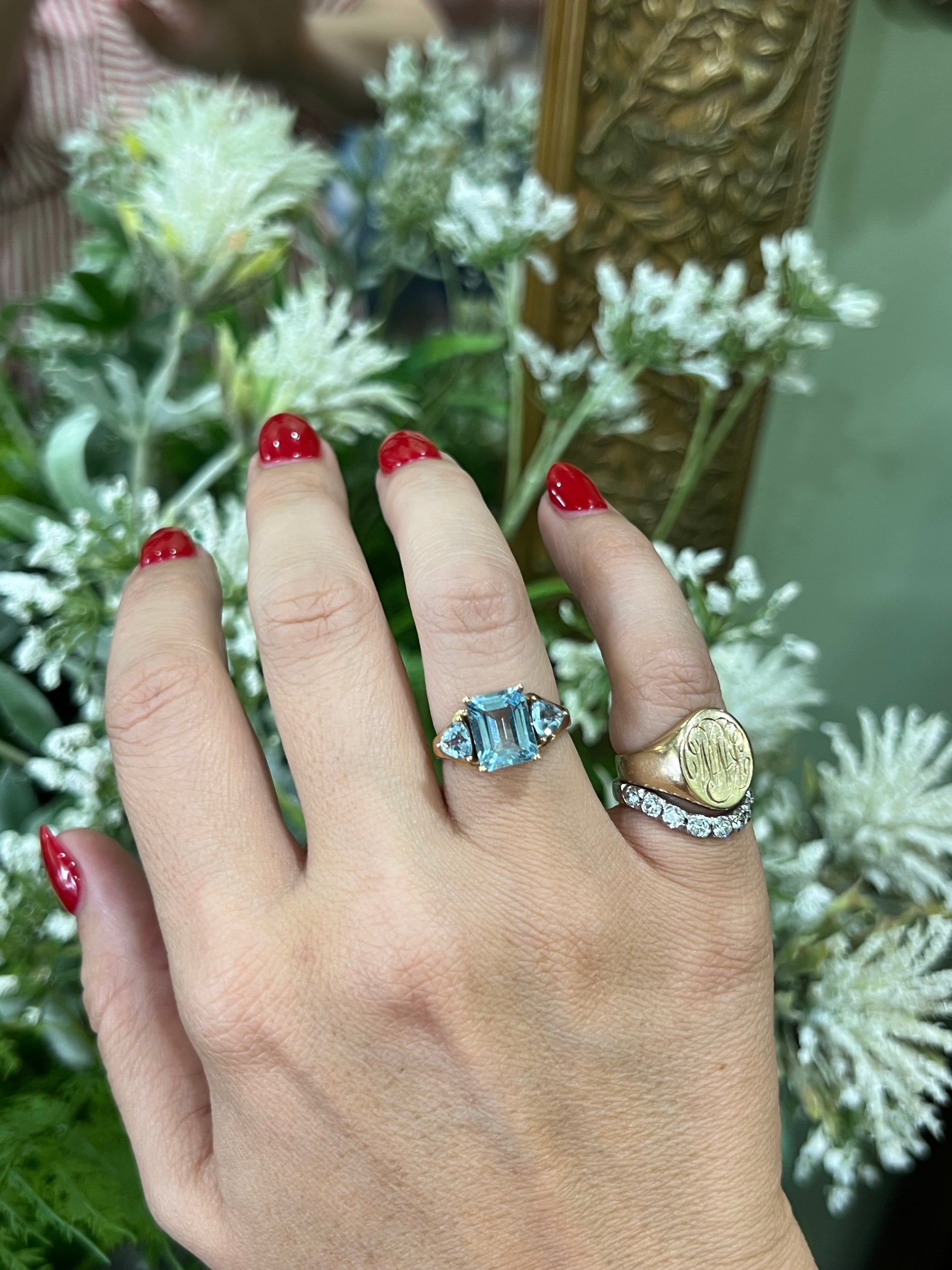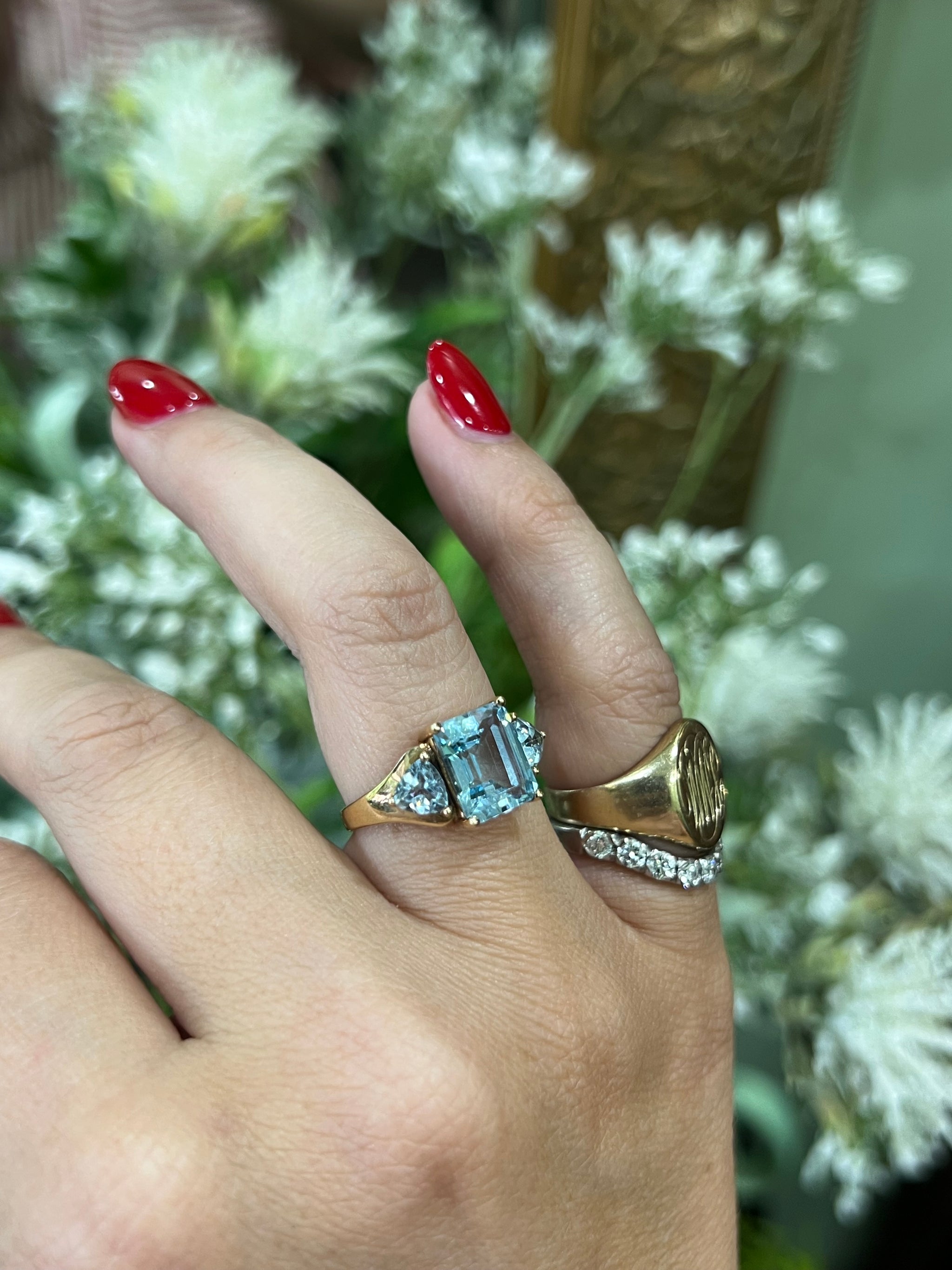 A trilogy of blue...  A Sky Blue emerald cut Topaz claw set, with a matching trillion cut topaz on either side.  The total carat weight of this vibrant ring is 5.21ct.
