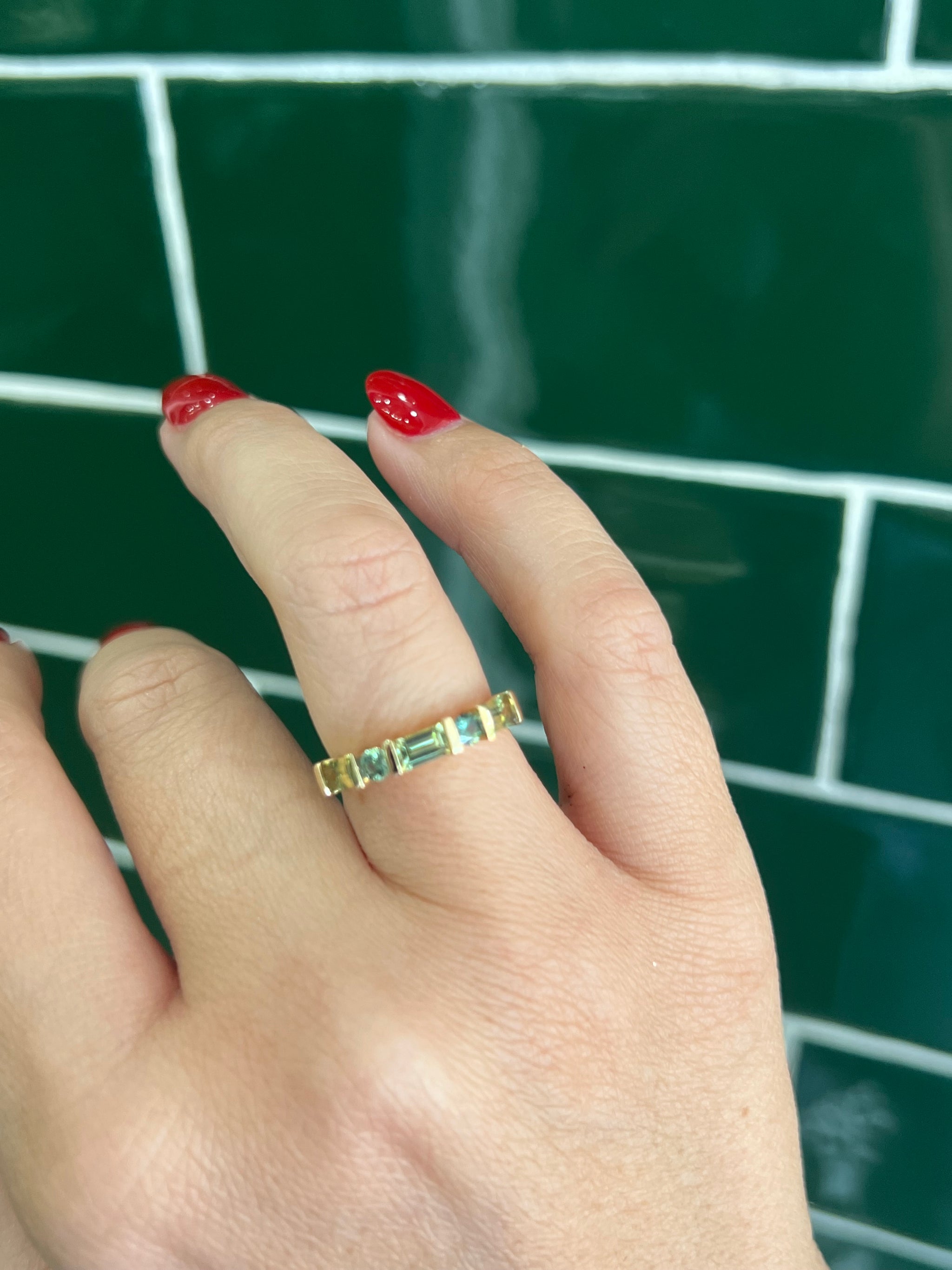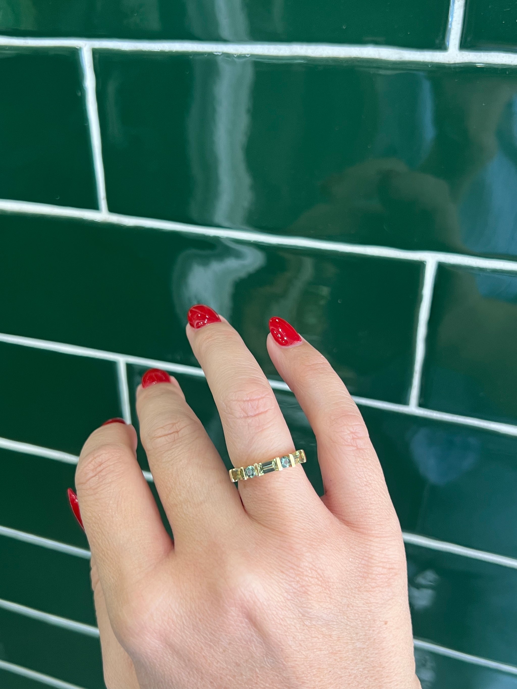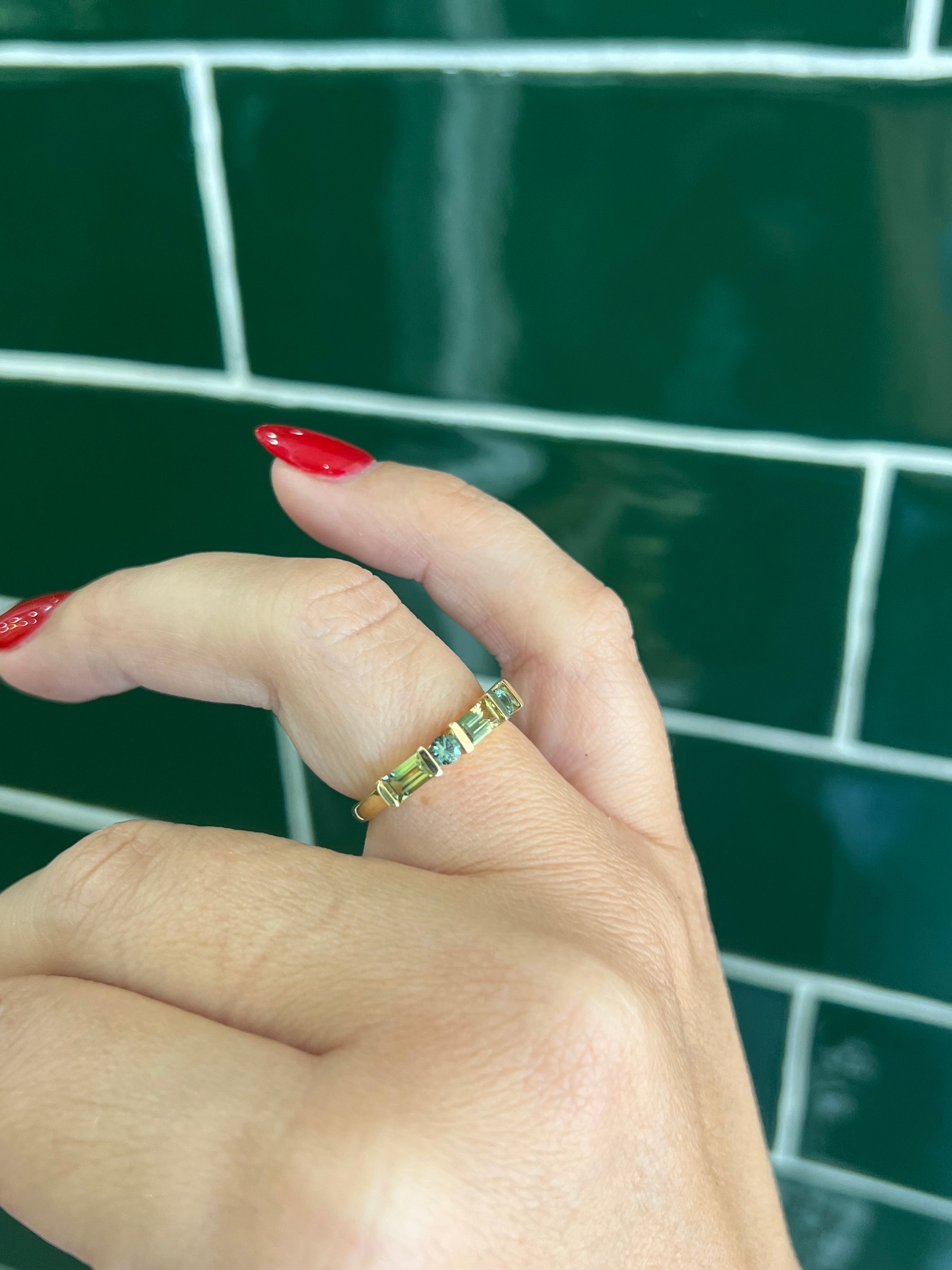 Baguette Parti Sapphires, paired with round Teal Sapphires in a unique band.
