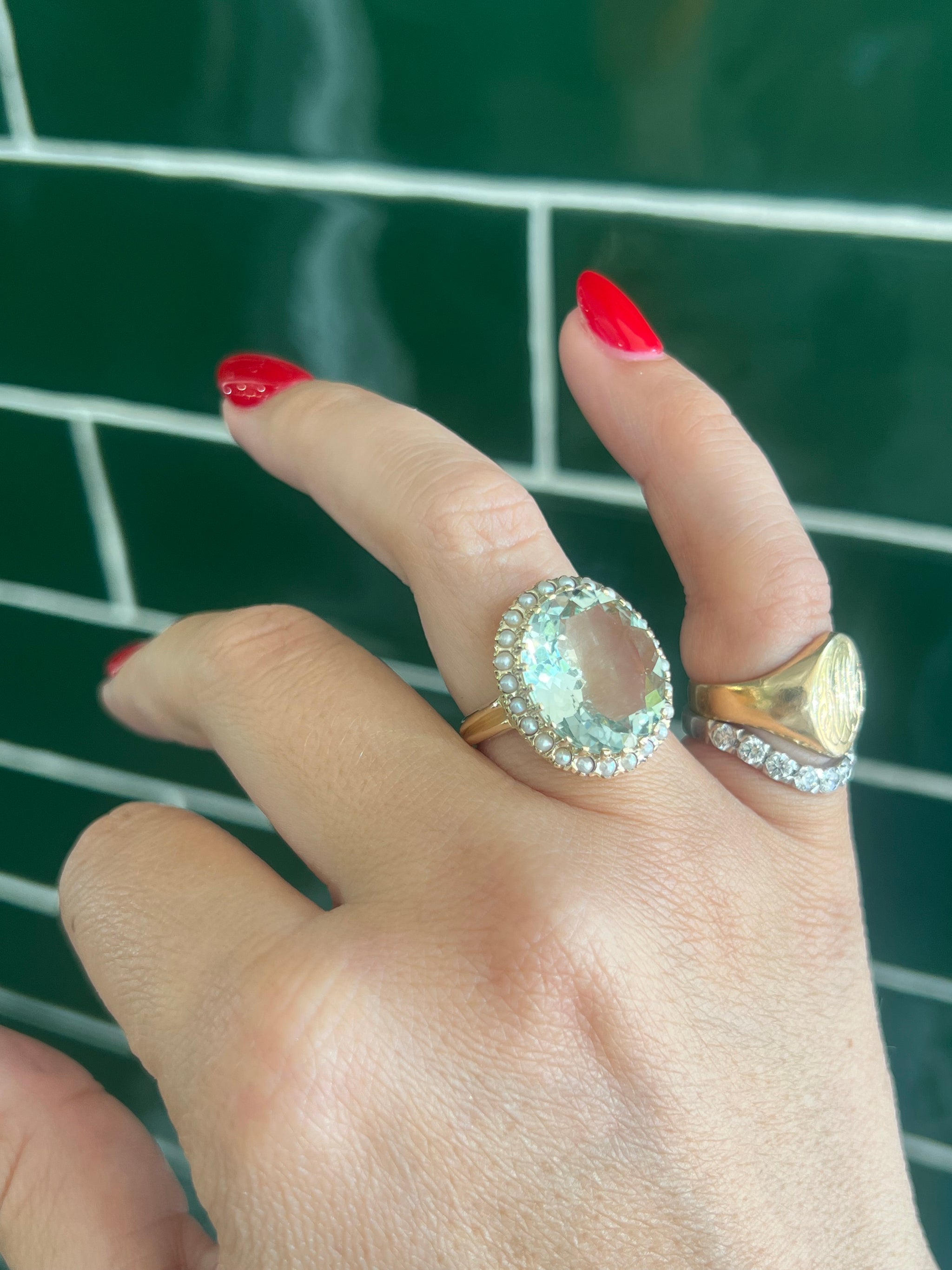 A fresh and feminine combination of large 6.1ct Green Amethyst and Seed Pearl cocktail ring.  The green centre stone catches the light at every turn.