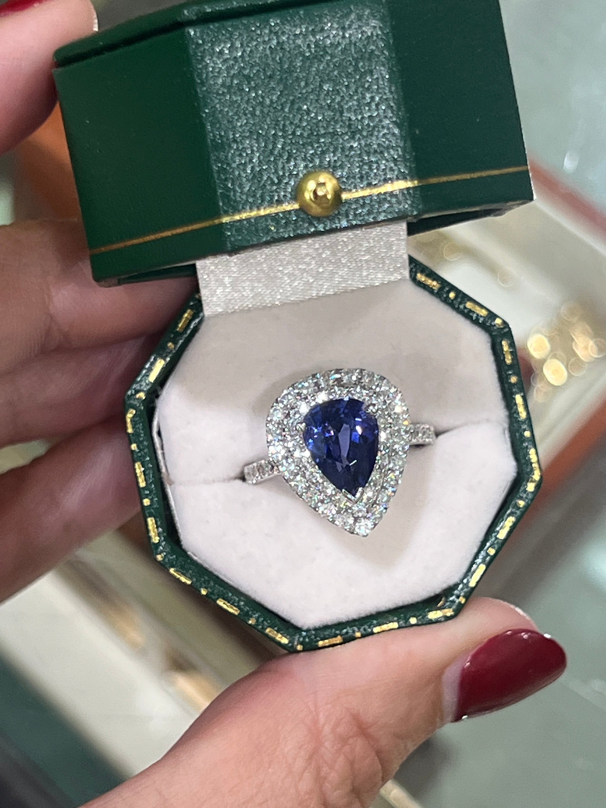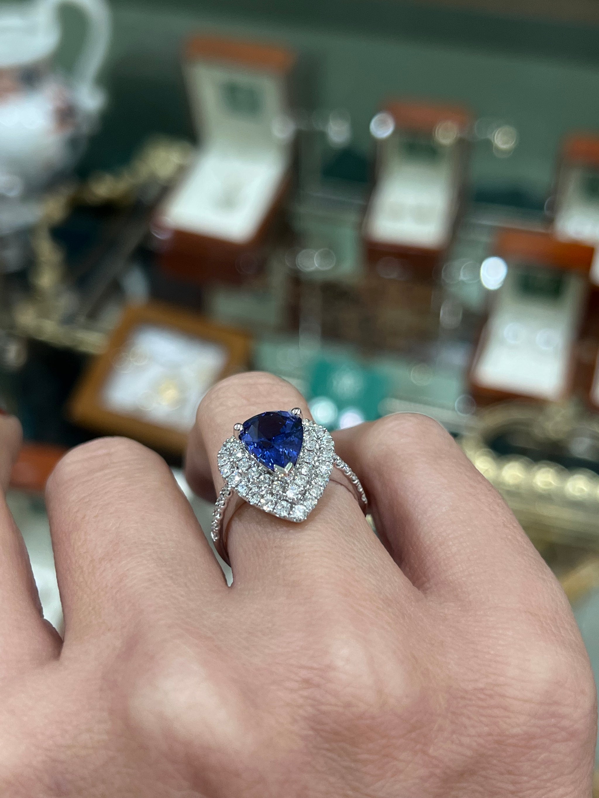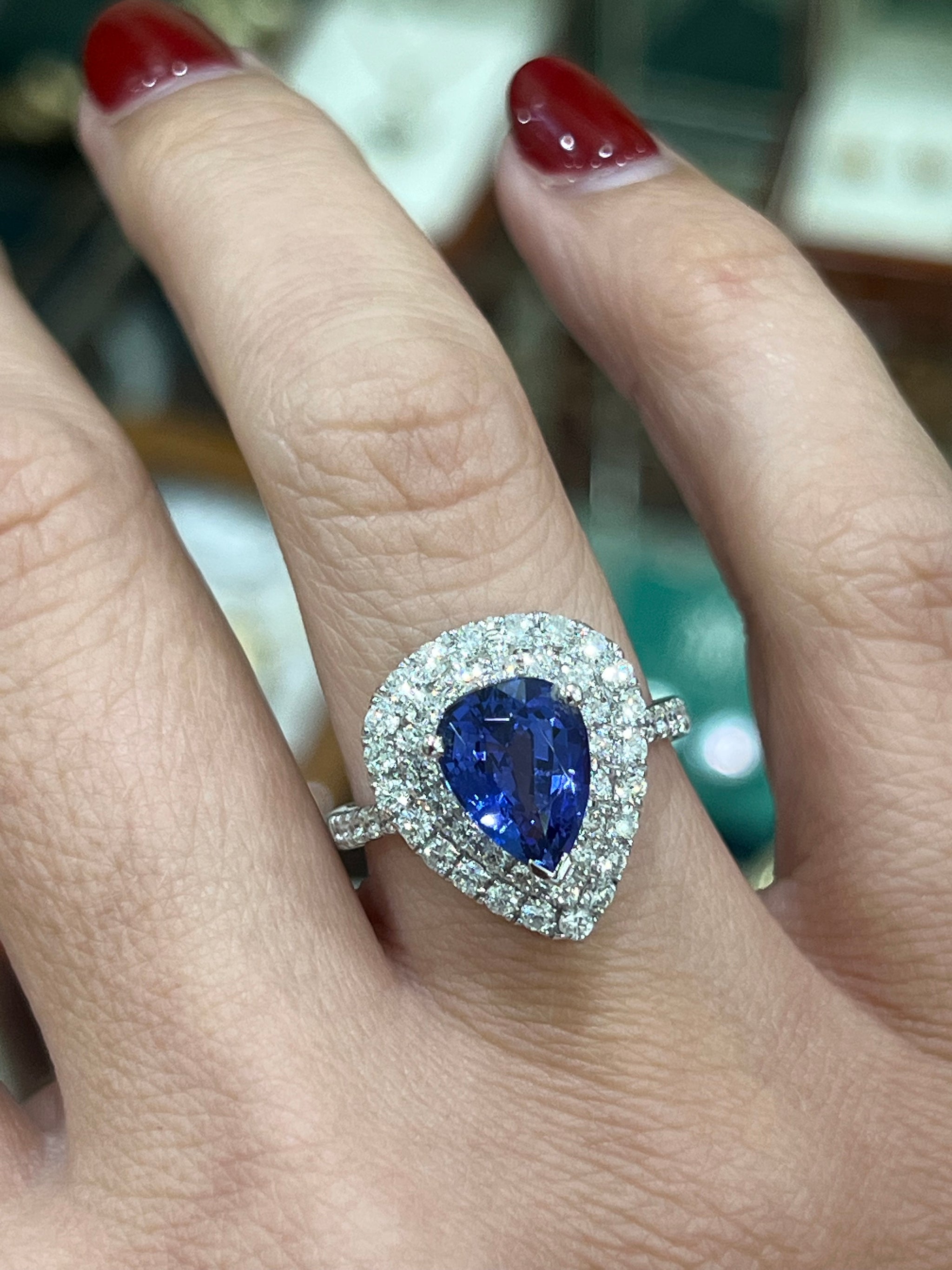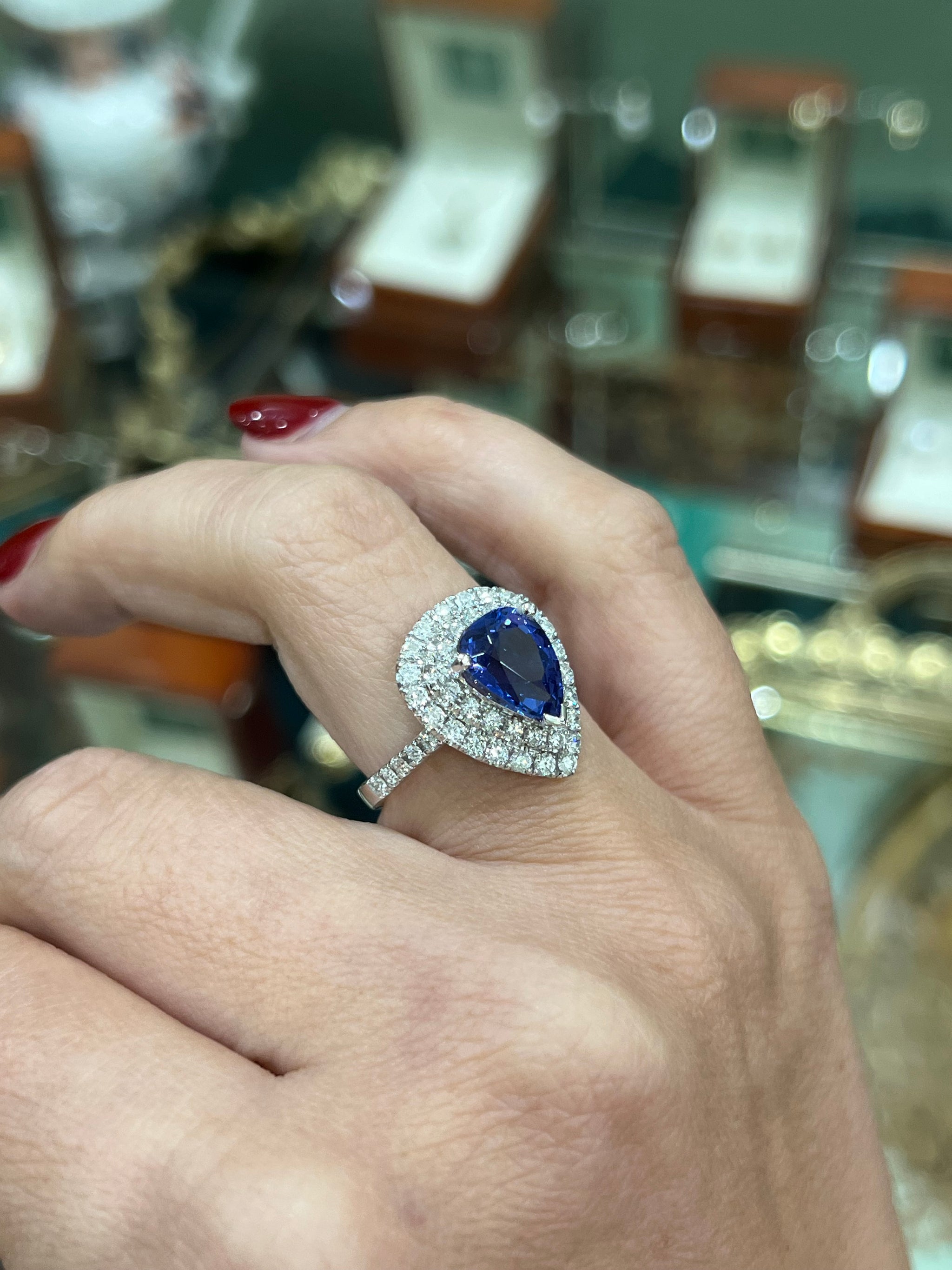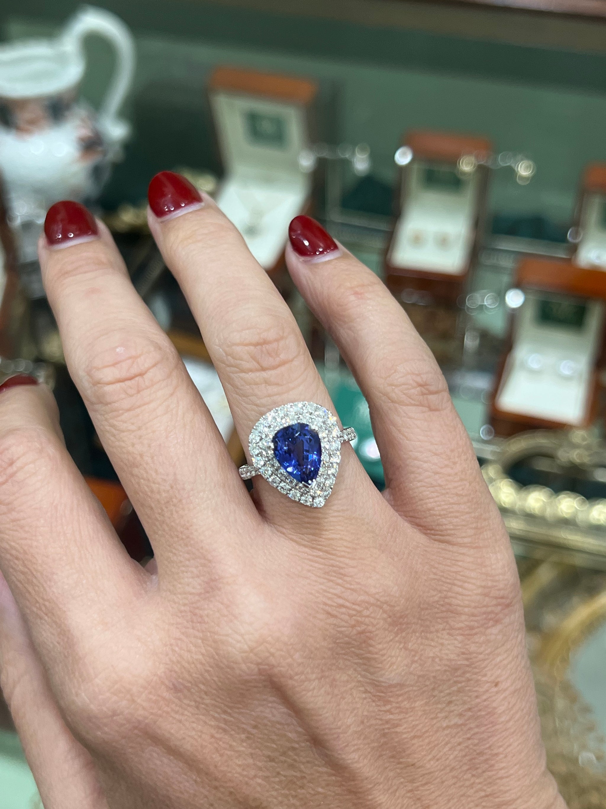 At the centre of this incredible ring is a vibrant blue 2.83ct pear shaped natural Tanzanite.  The main stone is claw set, and surrounded in a double halo of brilliant cut diamonds, that continue down the band.  There is a total of 1.00ct diamonds set into this divine ring.