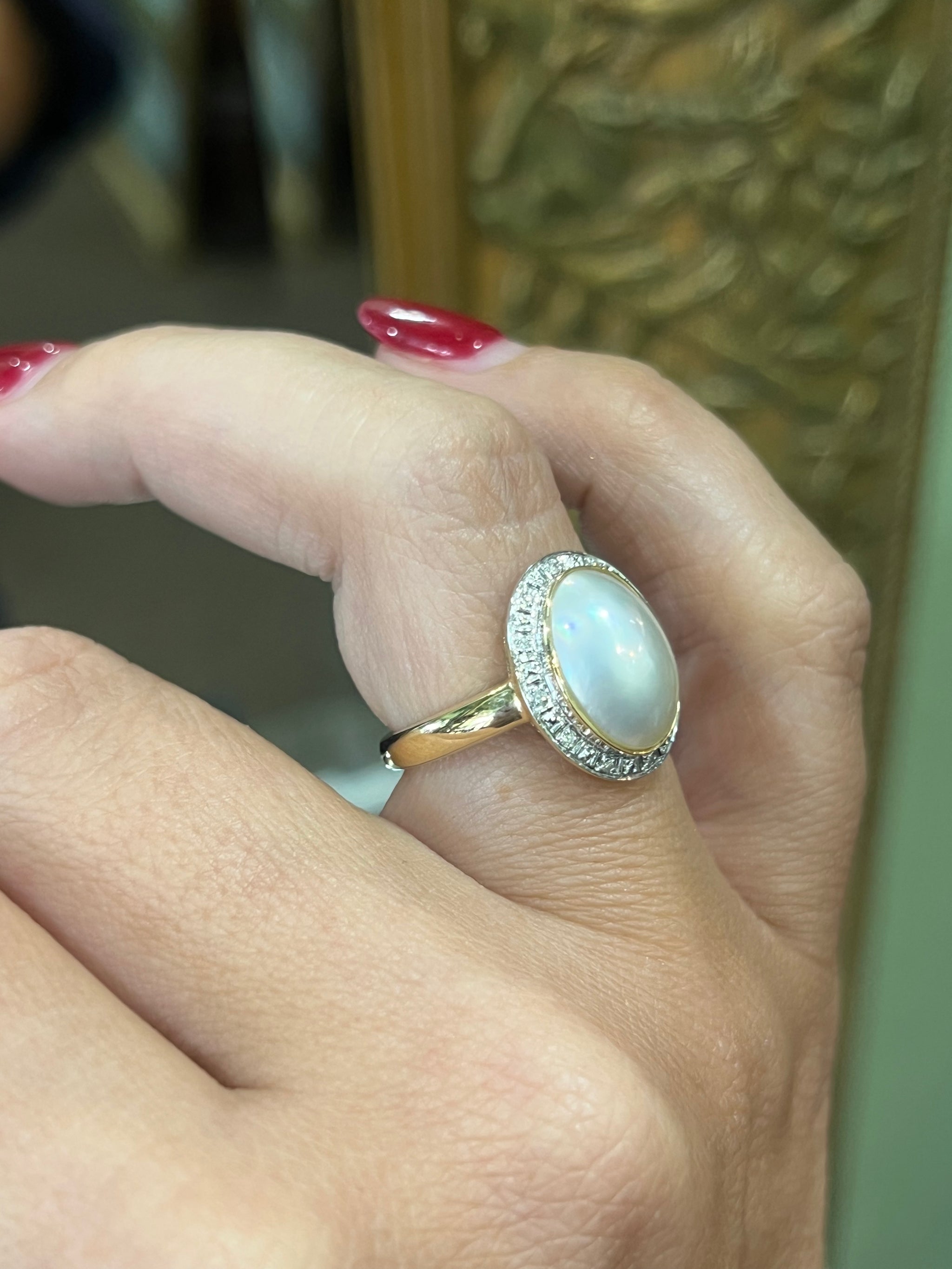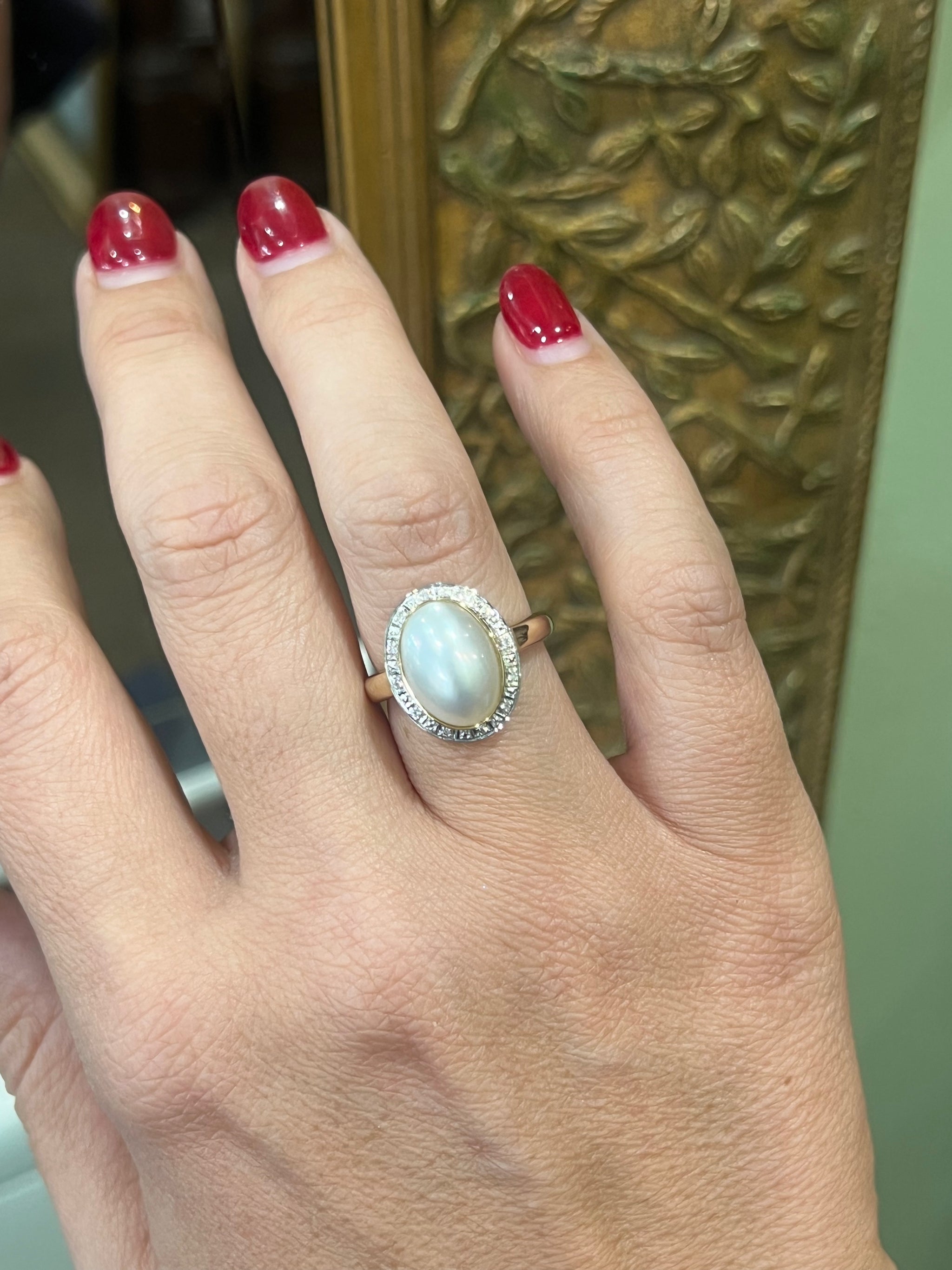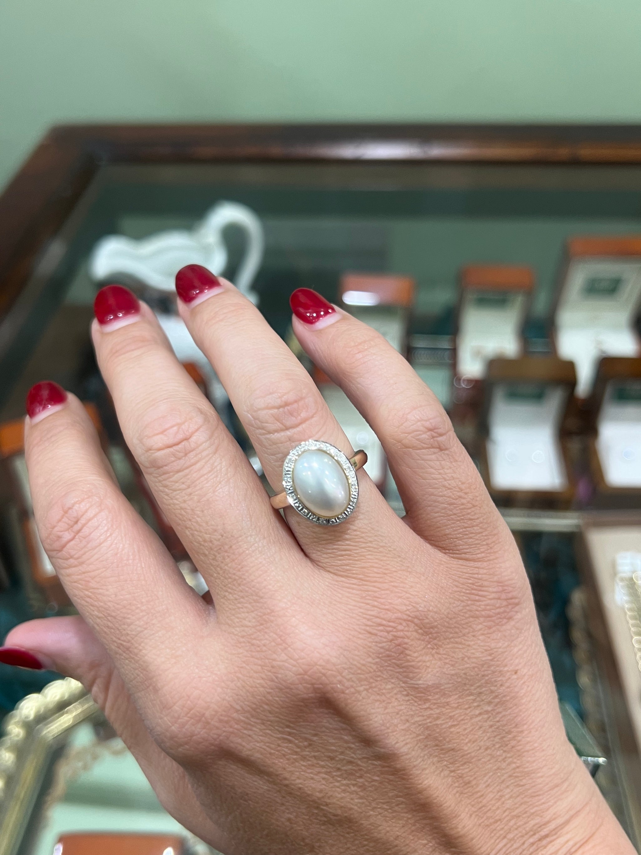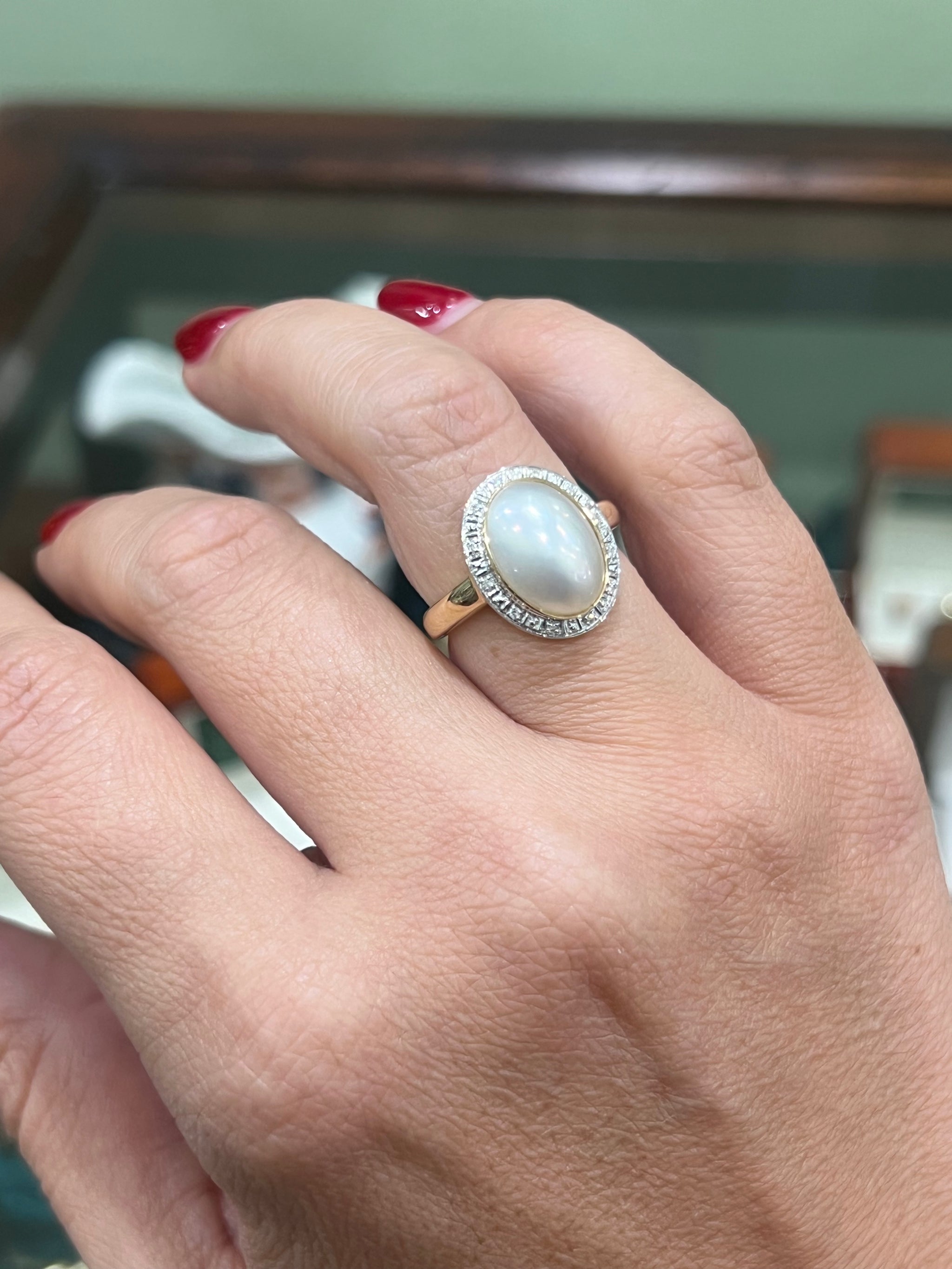 A lustrous oval shaped Mabe Pearl, bezel set in 9ct yellow gold.  The pearl is encased in a halo of 0.25ct of diamonds, with a yellow gold band.  A truly beautiful ring, for the person that has timeless style.